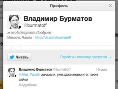 Количество подписчиков твиттера депутата Госдумы Владимира Бурматова увеличилось вдвое за девять дней и достигло 21 июля отметки в 343 тысячи фолловеров. После этого наблюдается монотонное снижение их числа. Блогер Евгений Козлов отмечает, что такое поведение характерно при покупке подписчиков. |
